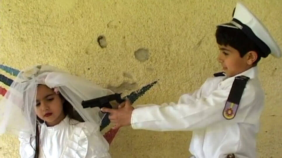 Dem eindrücklichen und vielschichtigen Kurzfilm „Masks“ (Masken) von Amitai Arnon und Esther Bires liegen Aufnahmen aus zwölf Jahren zugrunde. So lange haben die Filmemacher*innen zwei Geschwister, einen Jungen und ein Mädchen, mit der Kamera dabei begleitet, wie sie den Tag des Purimfests verbringen. So werden Abläufe von Kindheit und Pubertät in Israel dokumentiert. Über vielen Szenen schwebt ein Hauch von Surrealität, wenn zum Beispiel gezeigt wird, wie die Kinder ganz allein versuchen, die Gebrauchsanweisung für die damals in jedem israelischen Haushalt befindlichen Gasmasken zu verstehen. In dieser Szene manifestiert sich auch die kritische Einstellung des Films: Den Zuschauer*innen wird eine alternative Interpretation des Titels „Masks“ angeboten, eine subversive Verknüpfung von Krieg und Spiel.